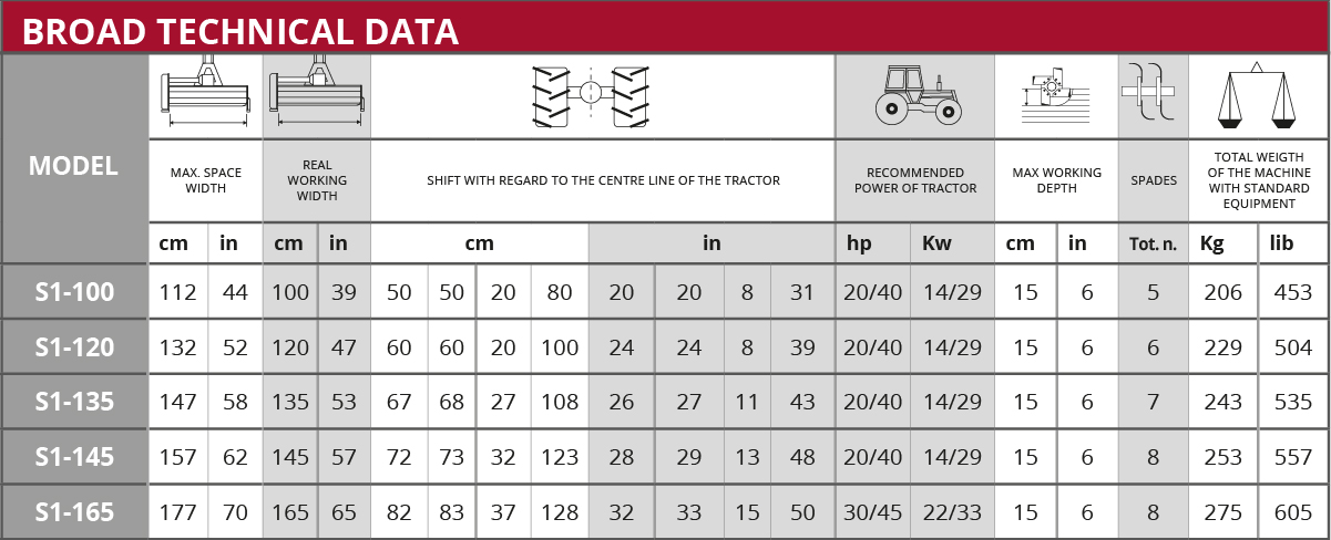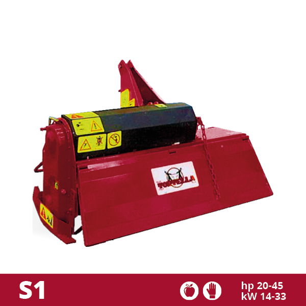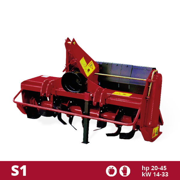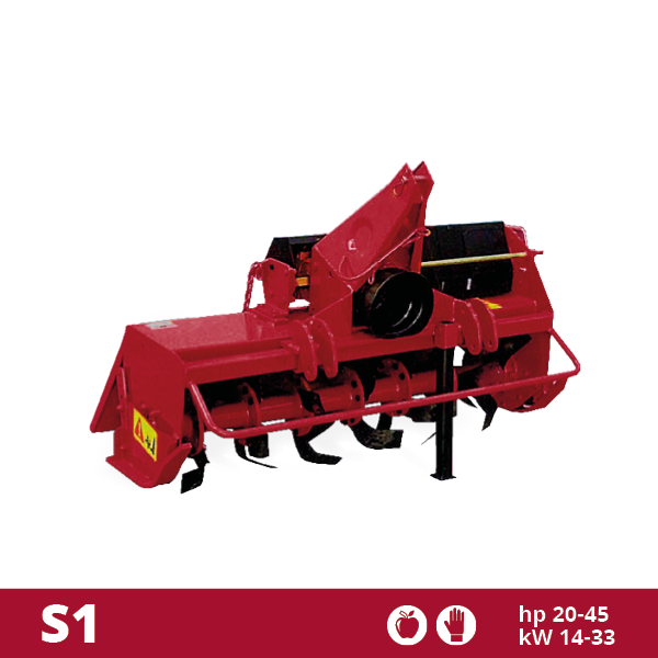The S1 series rotary cultivators are machines with chain drive and screw manual shift. They’re able to work the soil both in centered and in decentralised position with regard to the central axis of the tractor, and are ideal to work in fruit-farms, vineyards, nursery gardening, etc. and for soil working near plants and farming with areas difficult to be reached. They’re recommended to be used with low power tractors (from 20 to 45 hp) and are available in a wide range of dimensions.