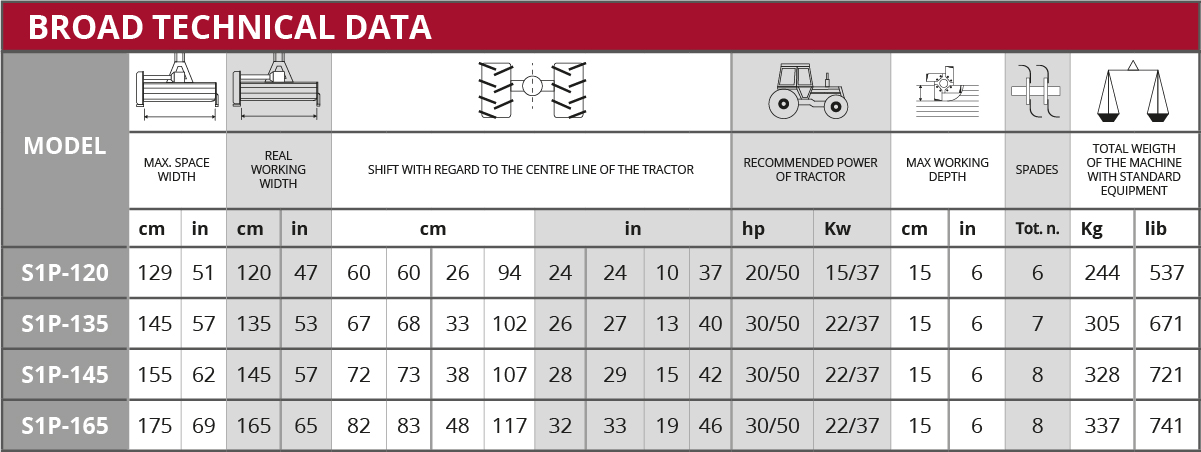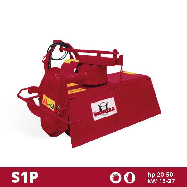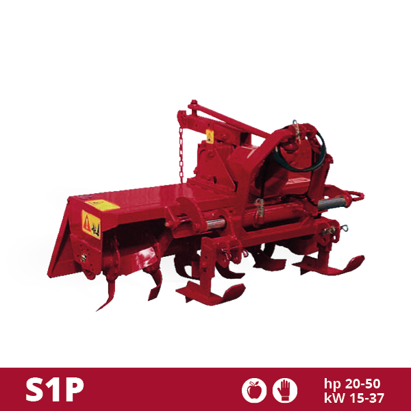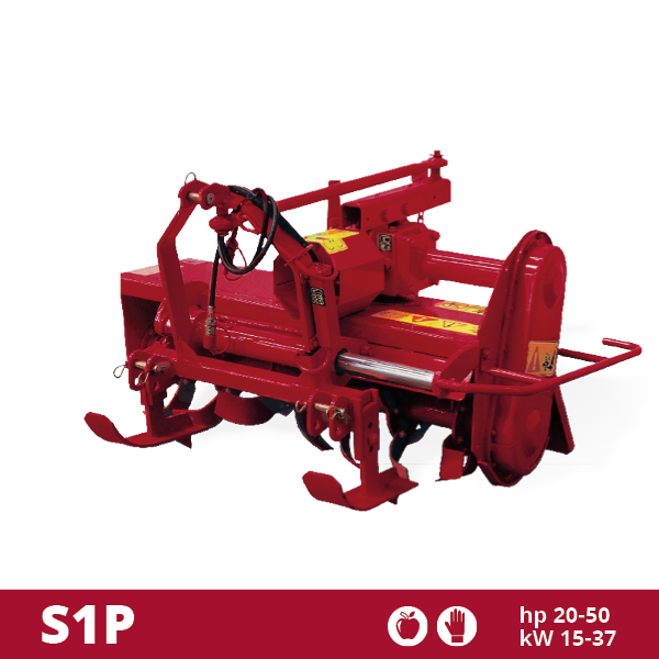 The S1P series rotary cultivators are machines with chain drive and hydraulic shift, that can be activated by the driving seat of the tractor. They’re able to work the soil both in centered and in decentralised position with regard to the central axis of the tractor, and are ideal to work in fruit-farms, vineyards and in general in all farmings that need a lane soil working in areas difficult to be reached. They should be used with small tractors having a power between 20 and 50 hp and are provided, on demand, with front or side saddles.