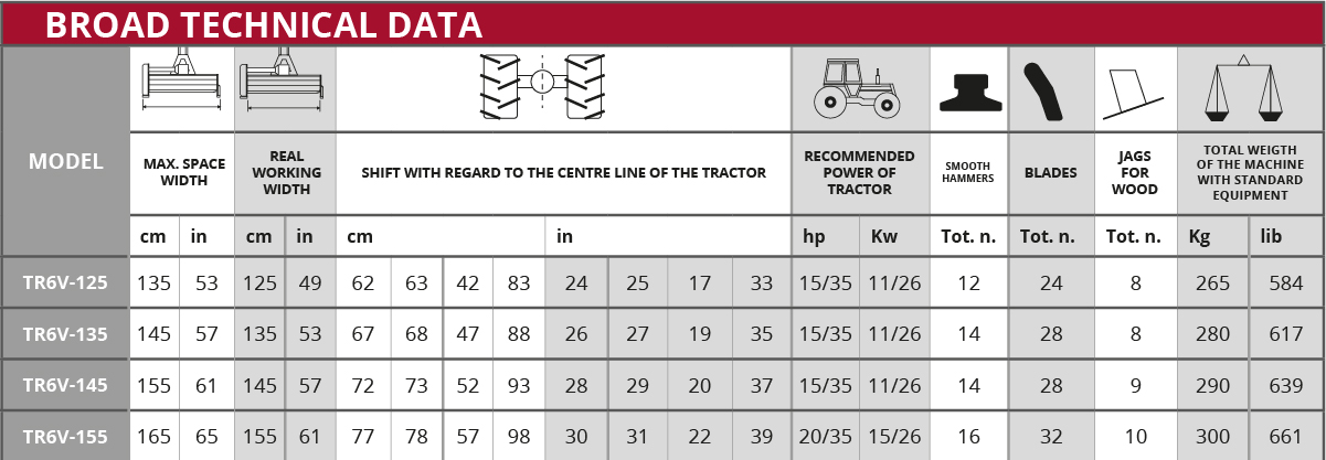 The TR6V series includes all shiftable shredders for pruning and grass, suitable for cutting small remains of pruning, brushwood and brambles, as well for grass mowing. They allow to achieve a finely cut and scraped rest also by starting from hard or resinous woods.